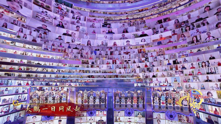 每场节目开篇,现场百人团和云中千人团将联动齐吟同一首诗词,拉开百舸争流、千帆竞发的文化竞技,在这一环节,通过千人视频连线技术,云中千人团的影像集合将被艺术性地幻化为旋转向上的天阶,营造出一种“欲与天公试比高”的攀登感。现场舞美以千年敦煌的恢弘穹顶作为灵感来源,呈现古今碰撞、四海共读的震撼场景,寓意经典诗词穿越古今,照耀当下,点亮人心。